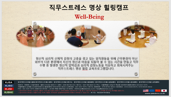 2. 한국직무스트레스힐링센터에서는 즐거운 직장과 건강한 직장생활을 위해서 직무스트레스 명상 힐링 캠프 교육 프로그램을 제안합니다.